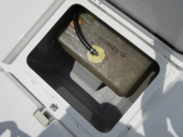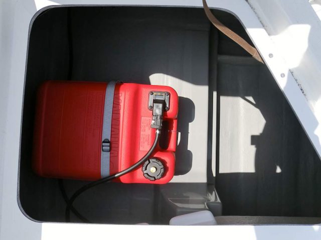 EXがデビューする前(2017年より前)の初期のノーマルは、F90も携行缶でした。初期のF50も携行缶でした。また、初期にはNP(船外機別売)仕様がありこちらは逆に固定式でした。ノーマルの中古艇購入の際は、燃料タンクを確認したほうがよいです。搭載船外機は換装で変わっている場合があるので、中古艇の場合は、船外機はF115なのに携行缶とか、F70だから携行缶と思ったらNP仕様で固定式、ということもあり得ます。